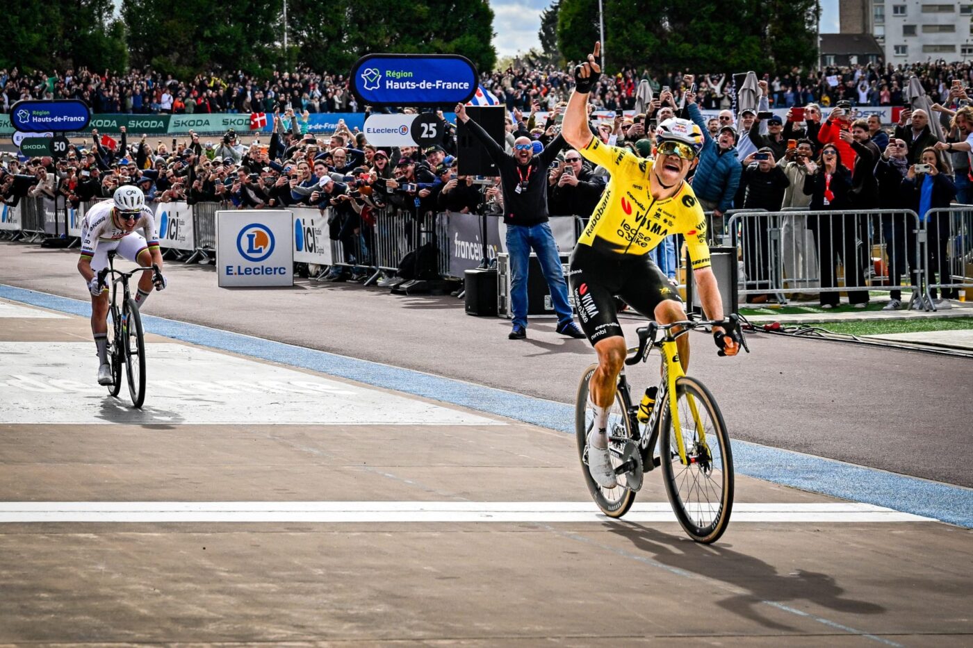 💪 What a sprint in Roubaix! Quel duel sur le Vélodrome de Roubaix ! ⚔️#ParisRoubaix 😈 pic.twitter.com/nLBB7wyncO