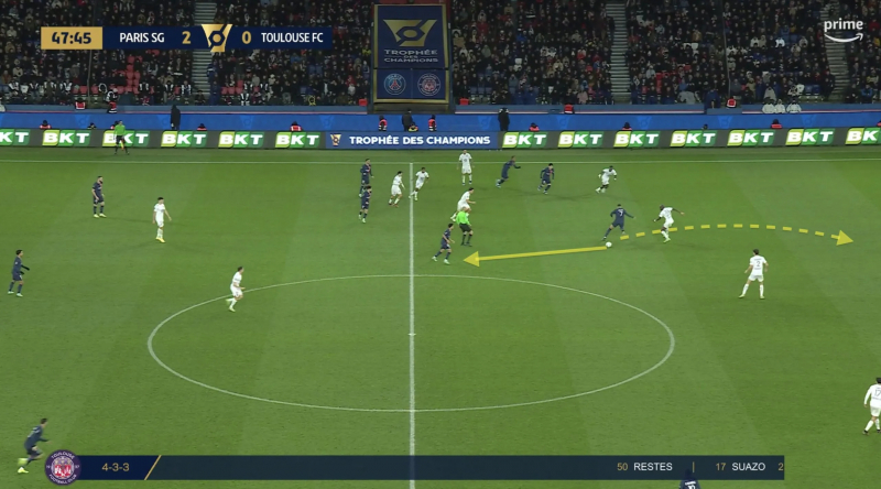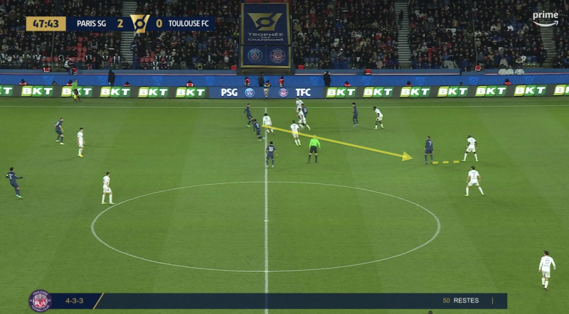 … puis va placer Zaïre-Emery face au jeu avant de démarrer. Malheureusement, le milieu parisien appuiera trop son ouverture en profondeur.