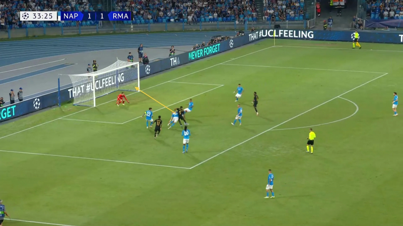 Le match, un enthousiasmant Naples-Real, était alors démarré depuis une bonne trentaine de minutes, Vinícius Júnior venait d’égaliser pour les visiteurs et Kepa de relancer court un six-mètres avec, à sa droite, Antonio Rüdiger. Là, tout a commencé avec, pour phase initiale du mouvement, un décrochage classique de Toni Kroos au niveau de son défenseur central gauche (Nacho), permettant de faire rapidement sortir un pion (Zieliński) du 4-1-4-1 déployé sans ballon par Rudi Garcia. Puis, alors que le ballon a été transmis à Camavinga le long de la ligne, Jude Bellingham, pointe haute du 4-3-1-2 madrilène (un système rarement utilisé en 2023, si ce n’est à Salzbourg), a déclenché un premier appel entre ses deux attaquants (Rodrygo et Vinícius Júnior), faisant reculer d’un coup la dernière ligne napolitaine. C’est à cet instant que la phase deux du mouvement a pu débuter avec un jeu de mouvements géant du Real qui a permis d’ouvrir un espace plein axe, où Bellingham est de nouveau venu s’insérer avant d’aller percuter balle au pied, de résister à un retour de Zambo Anguissa, de crocheter Østigård et de battre Meret. Espace laissé, espace détecté, espace attaqué : ainsi Jude Bellingham est venu rendre hommage à Luciano Spalletti.