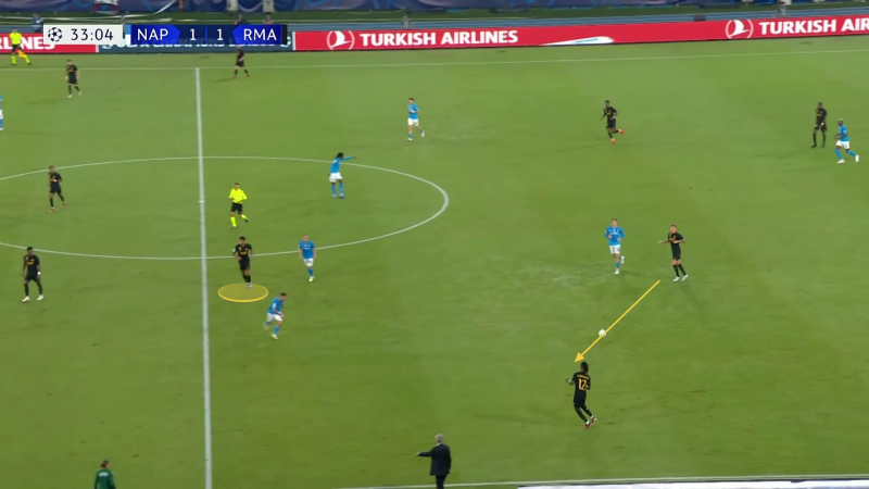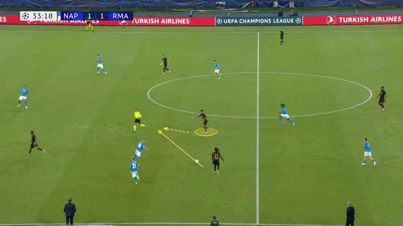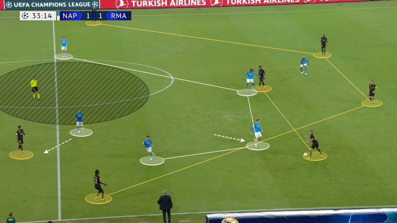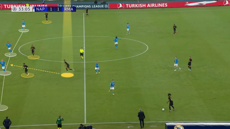 En image, voilà le moment où Bellingham détecte l’espace à attaquer plus haut pour faire stresser et reculer la défense du Napoli…
