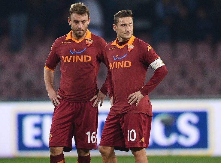 À peine le match lancé, que l’on ne peut s’empêcher de remarquer que les Milanais sont dans le dur. Très maladroits, ils multiplient les imprécisions, permettant aux Romains de s’illustrer dans leur registre favori : le contre. Toujours tranchants, les attaquants giallorossi ne tardent pas à se procurer de bonnes situations, contournant avec aisance le bloc adverse en passant par les ailes (notamment à gauche, Nagatomo ignorant la notion de repli défensif). Souci, les locaux pêchent dans le dernier geste, à l’image de Lamela et Osvaldo, malheureux dans leurs tentatives. Il leur faudra attendre une décision arbitrale pour concrétiser : suite à une perte de balle de Zanetti au milieu, Totti lance Bradley dans la surface, lequel évite le tacle de Ranocchia d’un saut. L’arbitre n’hésite pas bien longtemps et désigne le point de pénalty. Si le contact est discutable, l’excès d’engagement du central italien est bien réel, tout comme la lucarne de Totti qui s’ensuit (1-0, 22e). L’ouverture du score remotivera progressivement les Nerazzurri, plus appliqués en fin de première période. Et après un poteau de Livaja (38e), Guarín et Palacio se chargeront de relancer le match : le Colombien s’arrache et déborde sur le côté droit de la surface, pour servir son acolyte qui, à bout portant, fusille Goicoechea (1-1, 45e+1). C’est un brin sonnée que la Roma regagne les vestiaires.