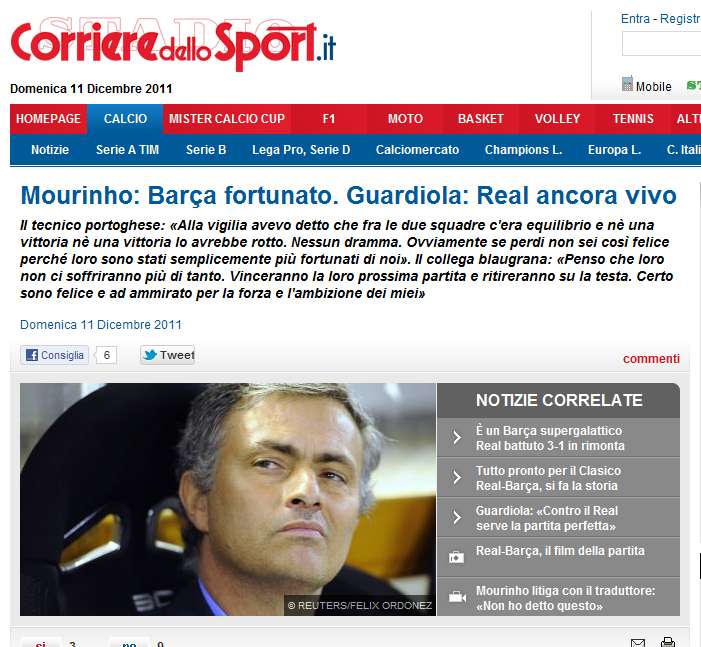La presse italienne est littéralement dithyrambique sur la prestation du Barça. Le Corriere dello Sport titre évidemment sur les Blaugranas, en martelant que « c’est un Barça supergalactique » . En Une de son édition dominicale, le quotidien a également une pensée pour le Mou : « Mou, le Barça est un cauchemar » . Cauchemar, bête noire : ce sont les termes qui reviennent pour définir l’équipe de Pep Guardiola. « Encore Barcelone. L’équipe de Guardiola est résolument la bête noire du Real et de Josè Mourinho, et gagne en renversant la situation à Bernabeu. Après la manita de l’année dernière, voilà maintenant la remuntada pour un Barcelone qui régale vraiment les esthètes du football, qui continue à faire du mal à Mourinho, et qui va maintenant s’envoler pour le Japon pour remporter aussi le Mondial Club » . Enfin, une petite dédicace pour Cristiano Ronaldo, nul hier soir. « Les deux occasions ratées par Ronaldo sont la preuve que le Portugais prend trop à cœur cette confrontation, et la foire quasiment à chaque fois » . Et la finale de Coupe du Roi se révèle bien l’exception qui confirme la règle.