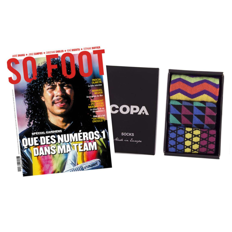 Un mot avant de vous quitter pour vous parler de nos coffrets collectors avec chaussettes Copa. La marque hollandaise fait des maillots iconiques (que nous vendons aussi dans des coffrets), mais pas que. Leurs habits de pieds (sic) sont tellement chanmés qu’on a décidé de les proposer en édition limitée avec quelques-uns de nos meilleurs livres ou magazines, quand ceux-ci ont un lien. On vous présente donc notre coffret sobrement intitulé « Gardiens de buts des 90s » 🧤