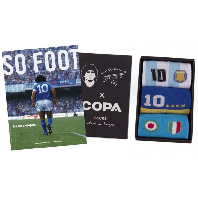 Autre petite pépite imaginée rien que pour vous : ce coffret Diego Maradona avec les chaussettes aux motifs de ses maillots les plus emblématiques. L’Argentine bien sûr, Boca évidemment et le Napoli forcément. Le tout agrémenté du magazine hommage de 484 pages que nous avions sorti après sa mort.