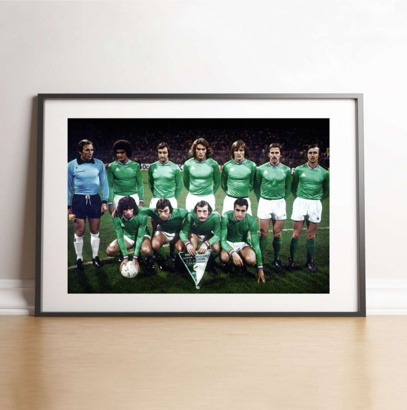 Je vais vous parler d’un temps que les moins de 20 ans ne peuvent pas connaître. Un temps où les Stéphanois étaient à une marche du toit de l’Europe. Un temps où aucun de nous n’aurait pu penser qu’un jour Saint-Étienne redescendrait en deuxième division… Sur cette photo, nous avons toute la génération dorée des Verts : Ivan Ćurković, Gérard Farison, Gérard Janvion, Christian Lopez, Osvaldo Piazza, Dominique Bathenay, Jean-Michel Larqué, Hervé Revelli, Patrick Revelli, Christian Synaeghel et, last but not least, Monsieur Dominique Rocheteau. Ce groupe avait été stoppé l’année précédente par le Bayern Munich en demi-finales, mais cette fois, plus déterminés que jamais, ils se battront jusqu’au bout pour arracher le nul (0-0) face au PSV Eindhoven et enfin accéder (grâce à leur victoire à l’aller 1-0) à la finale de Coupe d’Europe. Malheureusement, ils se feront battre par leur bourreau de l’année précédente, le Bayern Munich, sur le petit score de 1 à 0.