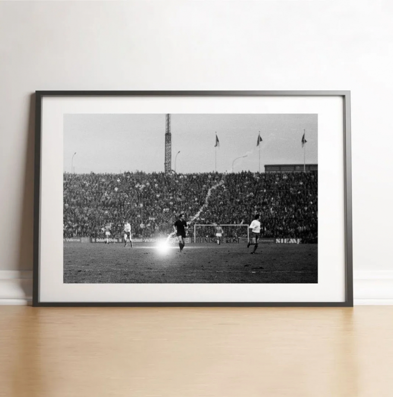 On connaît le mur jaune de Dortmund, Die Roten du Bayern, aujourd’hui il est question des supporters de Mönchengladbach. Lors du match contre Hambourg en 1971, le Borussia Mönchengladbach écrase son adversaire sur un score sec de 3 à 0. Sans surprise, le stade bouillonne, criant fièrement son bonheur de soutenir son club de cœur, et dans l’ambiance et la ferveur du moment, un fumigène est lancé sur la pelouse, juste à côté de l’arbitre ! Heureusement, personne n’est blessé et le photographe a su merveilleusement saisir l’instant, offrant à la postérité une image magnifique avec le contraste si particulier du noir et blanc qui met en lumière le fumigène au milieu du stade.