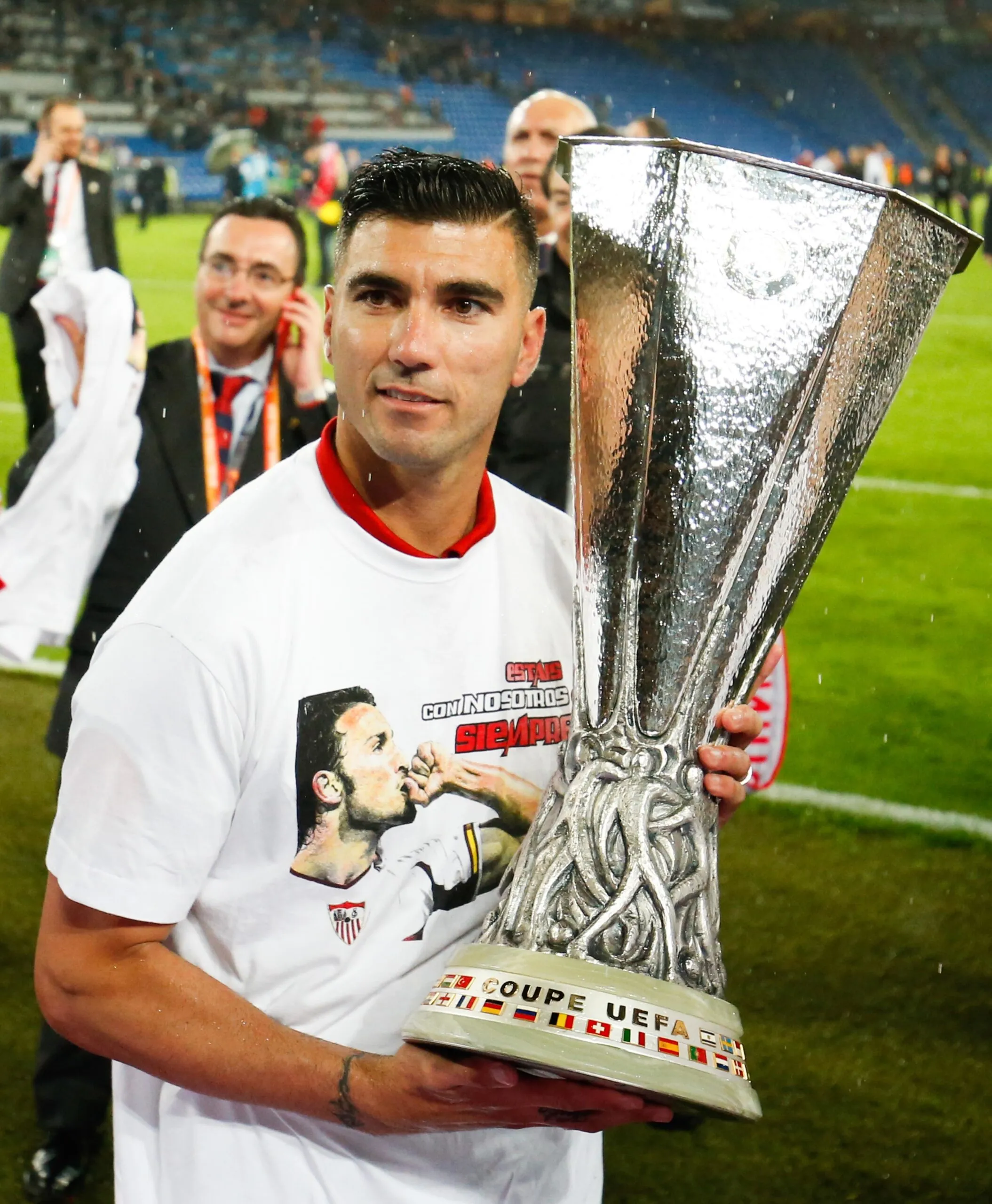 Trois ans plus tard, lui et l’actuel défenseur du PSG soulevaient la Coupe du monde dans le ciel de Johannesburg, avec un maillot d’Antonio Puerta les reliant. Alors que celui qui avait ouvert la voie aux Coupes d’Europe prenait le chemin de Manchester City, un autre enfant du club (ré)apparaît dans le récit sévillan : José Antonio Reyes. Lui aussi formé au Séville FC, il est même celui qui guide Jesús Navas lorsqu’il fait ses débuts à 18 ans. De retour au bercail après huit ans de vadrouille entre Londres et Madrid, il deviendra l’homme qui consolidera le palmarès européen des Nervionenses, grâce à l’expérience de ses deux titres glanés déjà en Ligue Europa du côté de l’Atlético de Madrid (2010 et 2012). Avec son numéro 10 et son brassard de capitaine, le milieu offensif remporte la coupe en forme de corbeille à papier trois saisons de suite, battant le Benfica (0-0, 4-2 TAB), le Dnipropetrovsk (3-2) puis Liverpool (3-1). Lorsqu’il soulève le trophée pour la dernière fois au Parc Saint-Jacques de Bâle en 2016, José Antonio Reyes portait d’ailleurs un T-shirt avec une photo d’Antonio Puerta et les mots « Tu es pour toujours avec nous ».