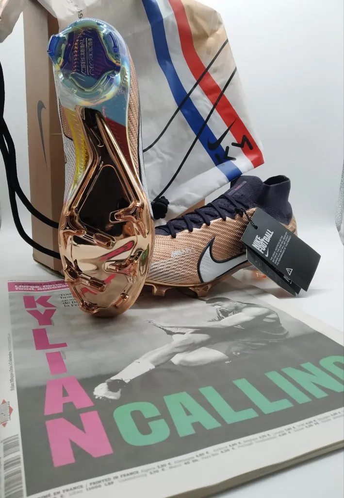 On trouve aussi le modèle des chaussures de Kylian Mbappé de la finale de la Coupe du monde 2022. Prix estimé par l’expert Catawiki : 1200 euros.