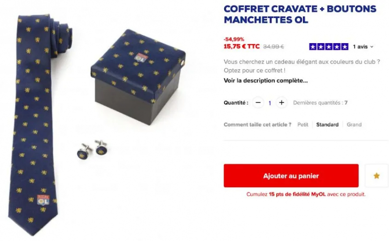 Depuis le passage de l’Olympique lyonnais sous pavillon américain, mieux vaut respecter le dress code pour se rendre au Parc OL. Pour cela, rien de mieux que de profiter de la belle réduction sur le coffret proposé par le club offrant une cravate et des boutons de manchettes estampillés OL. Au prix initial de 34,99 euros, pas sûr que les clients se bousculent pour un accessoire aussi kitsch, mais avec une promotion de 55 %…
