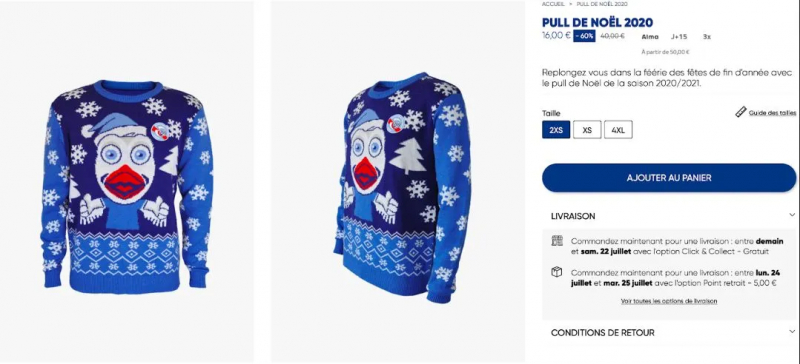 Il n’est jamais trop tard pour larguer ses invendus. Le RC Strasbourg laisse toujours en vente ses pulls de Noël de 2020 et les 60% de réduction laissent deviner une réelle volonté de s’en débarrasser. Pour ne rien arranger, le personnage représenté fait extrêmement peur. Après plusieurs mois d’enquête, nous pouvons assurer qu’il s’agit d’une cigogne, qui se trouve au milieu des sapins et des flocons.