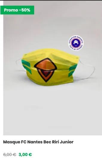 Vu que les enfants ont été moins touchés par les effets directs du Covid, le FC Nantes décide de brader ses masques : 50% de réduction pour passer de six à trois euros. Lavable et réutilisable jusqu’à cinquante fois, ce masque n’est pourtant pas facile à porter en dehors de la Beaujoire.