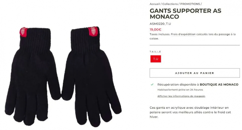 Dans l’onglet « soldes » du club monégasque, on retrouve une paire de gants… pas en promotion. Vous pouvez tout de même profiter de cet équipement avec doublage intérieur en polaire pour faire face aux 30 degrés de moyenne qu’affronte la Principauté chaque jour.
