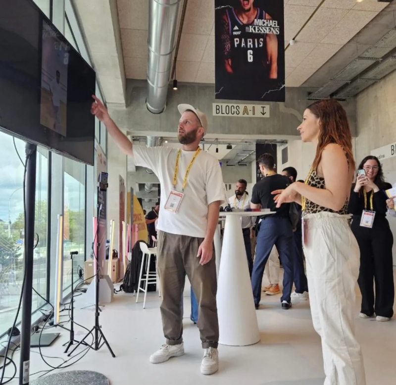 Quelques jours après un match 5 fou remporté par le Paris Basketball face à l’ASVEL afin de se hisser en finale du championnat de France, le lieu a été totalement repensé pour la journée. Les coursives voient notamment apparaître un espace innovation, accueillant plusieurs start-up comme VOGO, qui propose l’espace d’un instant de se muer en arbitre VAR ou Footsider, le « LinkedIn du football ». Dans la fosse, à quelques mètres du podium, centre névralgique de l’événement, la fameuse fan expérience bat son plein devant les phases finales de l’Esport Challenge, un tournoi de Rocket League.