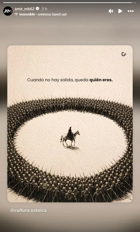 14h12 : la story philosophique du jour est signée Amir Murillo. Mis au placard par l’OM, le Panaméen doit trouver une porte de sortie cette hiver. Mais le défenseur a notifié un gros problème : « Quand il n’y a pas d’issue, il ne reste que toi. » La musique, signée de l’artiste Insensible, ouvre une piste de compréhension : le joueur est dans l’impasse.