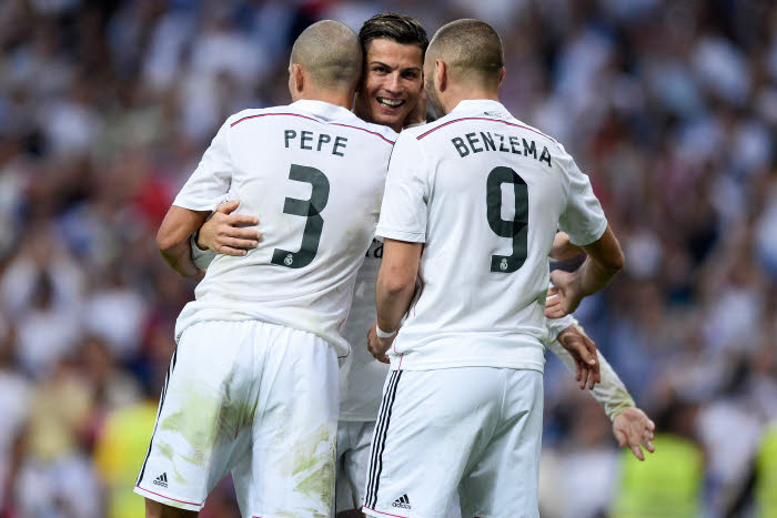 Le but de Neymar Le pénalty de Cristiano Ronaldo Le coup de tête de Pepe Le but de Karim Benzema Luis Enrique, bon perdantLes trois buteurs du Real Madrid.