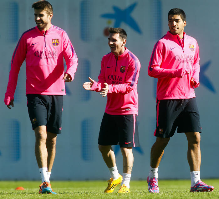 Piqué, Messi, Suárez, à l’entraînement hier.