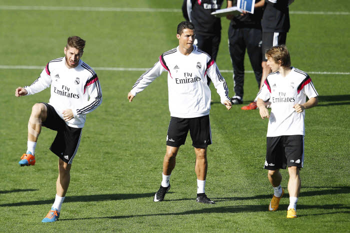 Ramos, Ronaldo, Modrić, à l’entraînement hier.