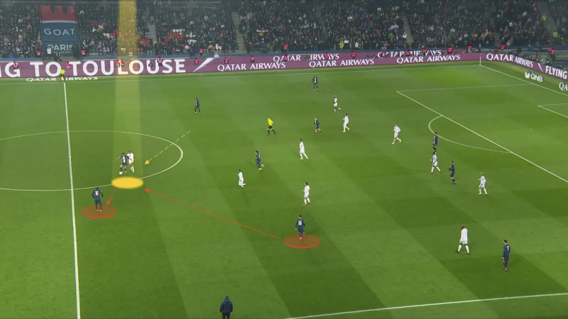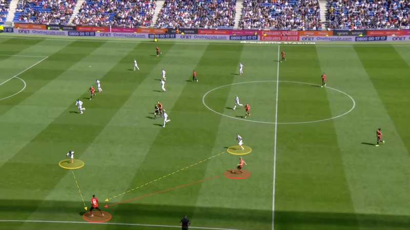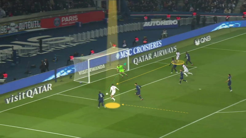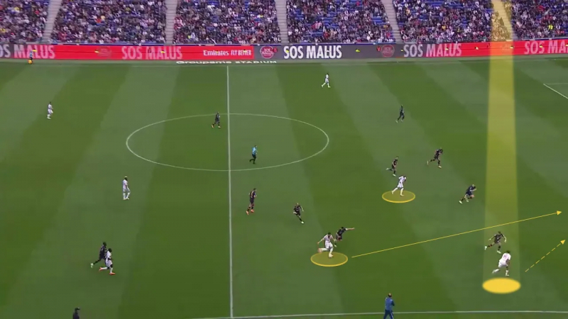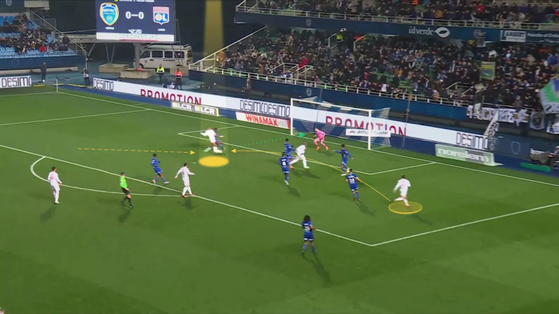 Côté gauche cette fois, la réalisation est différente, mais l’intention est la même. En premier lieu, Barcola rentre sur son pied droit et s’appuie sur Caqueret. Au même moment, le jeune Lyonnais démarre dans l’espace libre pour solliciter le une-deux…