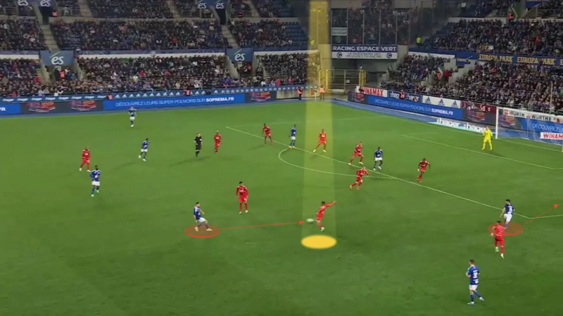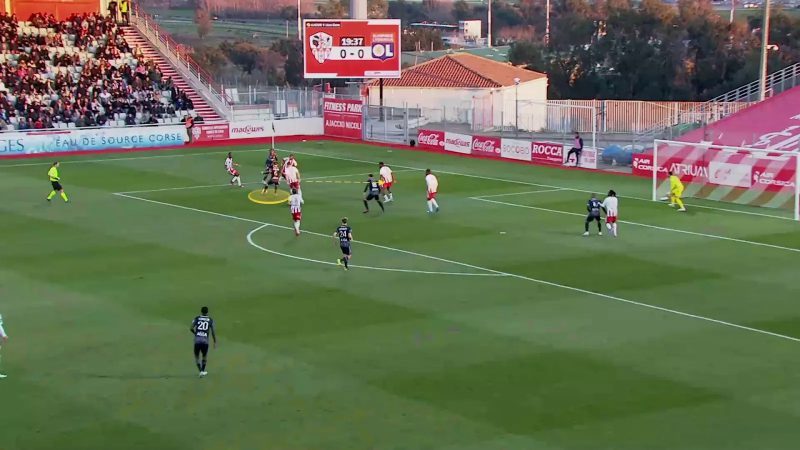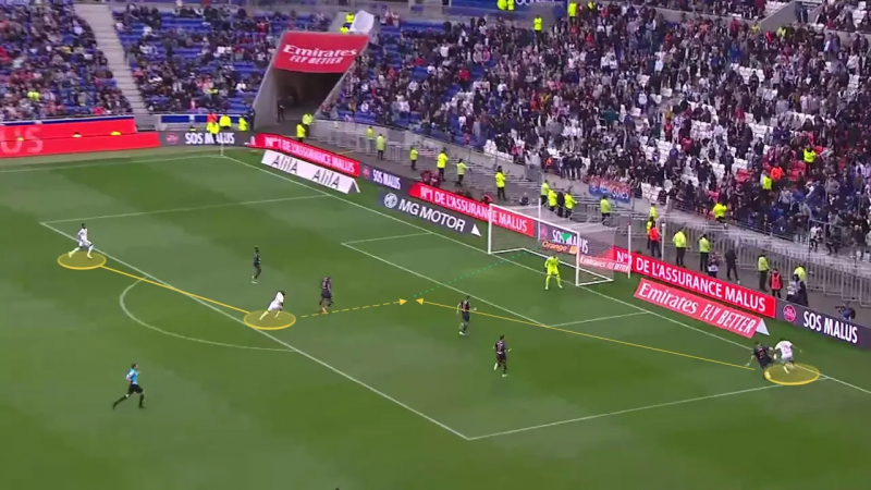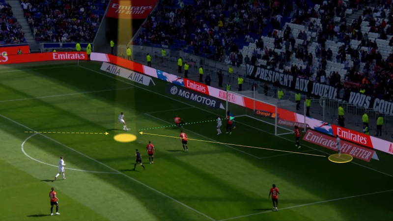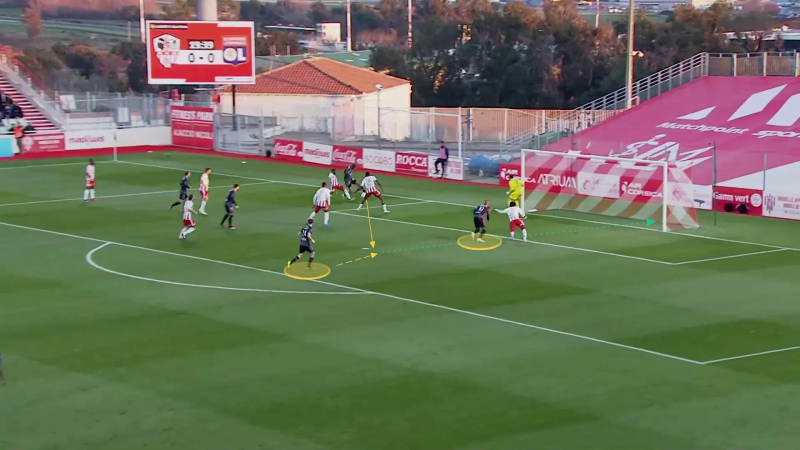 Il prend d’abord le dessus sur Sainte-Luce à la course, ce qui oblige Maxime Estève à couvrir. Grâce à son léger temps d’avance, il peut ensuite tenter de trouver Lacazette dans la zone de vérité. Dans le dos de Christopher Jullien, l’attaquant lyonnais peut finalement surgir pour surprendre son vis-à-vis et catapulter le centre parfait de Barcola sous la barre.