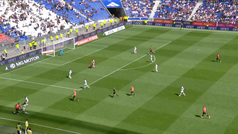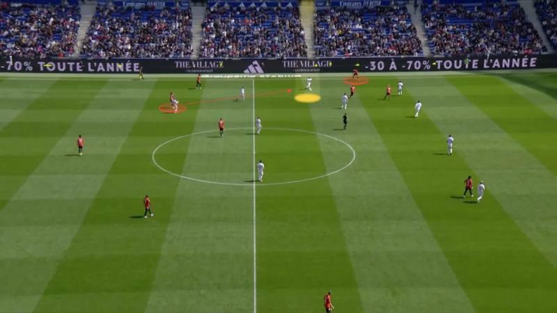 Face à Rennes, Lyon est cette fois un peu plus haut, et Barcola interprète parfaitement la passe extérieure de Theate, pourtant réputé pour particulièrement appuyer ses ballons.