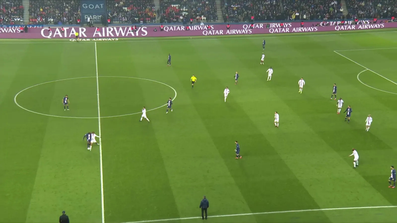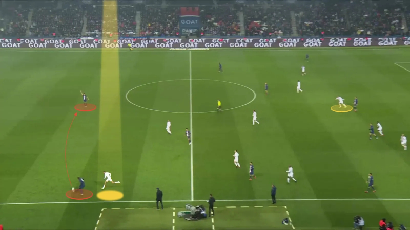 À Paris, Barcola entame son pressing sur Marquinhos à la suite de la passe en retrait de Messi. Le Lyonnais oriente bien sa course vers l’extérieur et met de l’impact sur sa sortie, ce qui force le Brésilien à jouer vers Danilo…