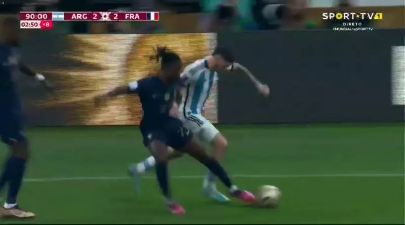 Nouvelle prise à deux de Tchouaméni et Upamecano sur le Parisien, mais une fois de plus les Français sont à contre-temps et mal orientés, l’Argentin peut à nouveau écarter sur Di María côté gauche.