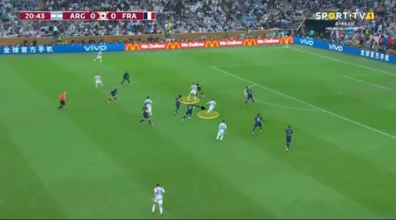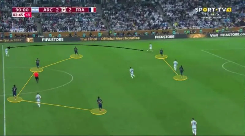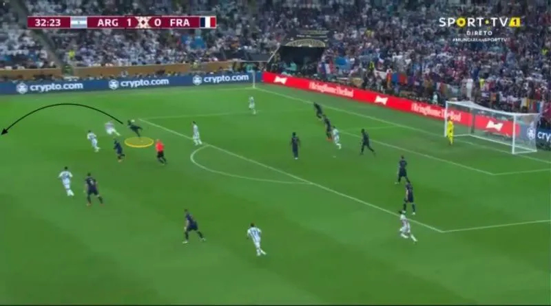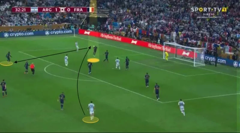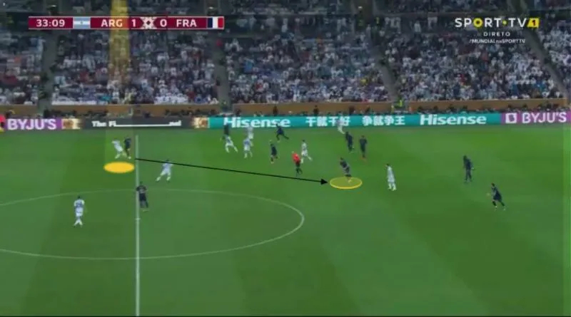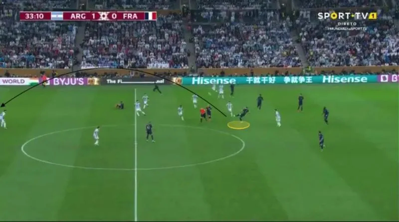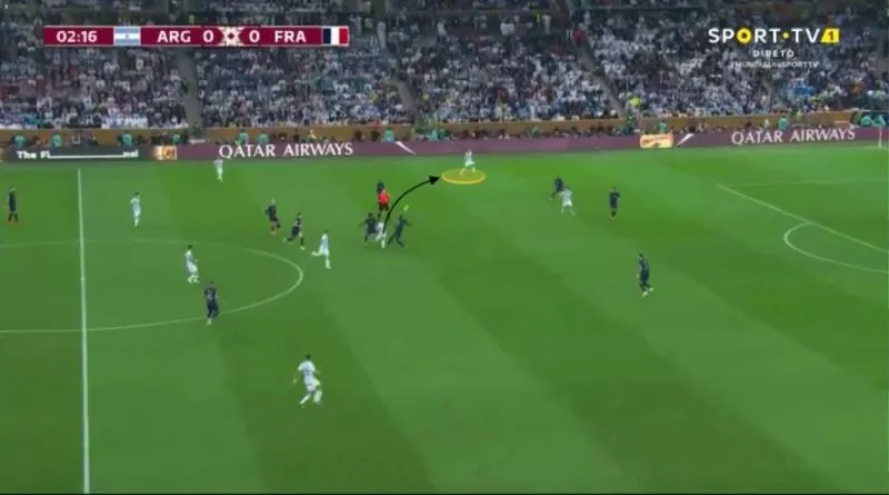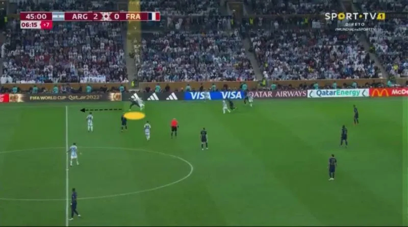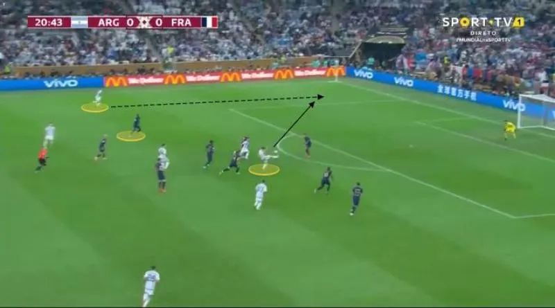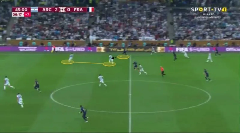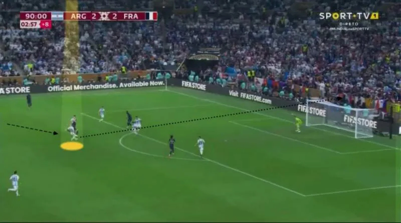 Bien facilité par les soucis français, le plan de jeu de l’Argentine se trouve là. Trouver un joueur à l’intérieur pour percuter balle au pied comme peut le faire Enzo Fernández ou jouer dos au but avec Julián Álvarez pour trouver Messi, qui verra ensuite sa diagonale favorite vers le côté gauche s’ouvrir. Le tout bien facilité par les appels intérieurs d’Alexis Mac Allister visant à aspirer Jules Koundé. La France ayant déjà eu du mal à contenir les incursions axiales dans son bloc face à la Pologne de Grzegorz Krychowiak ou l’Angleterre de John Stones, cela a ouvert beaucoup d’opportunités aux Argentins qui ont bien flairé le coup. Le pied d’El Fideo s’est ensuite occupé du reste, qui a, comme souvent, répondu présent dans une finale disputée par l’Albiceleste :