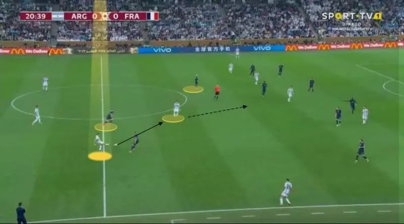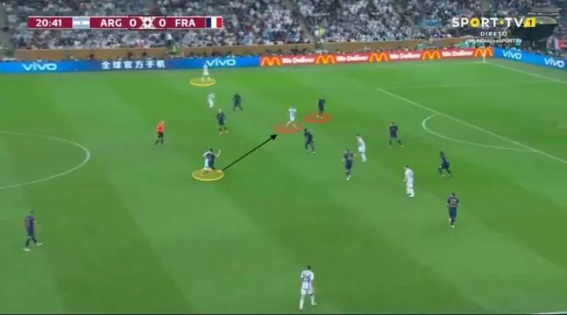 À la 20e minute, Rodrigo de Paul trouve facilement une passe intérieure vers Enzo Fernández. Le milieu de Benfica se positionne entre Giroud et Griezmann, une zone que la France a souvent peiné à défendre…