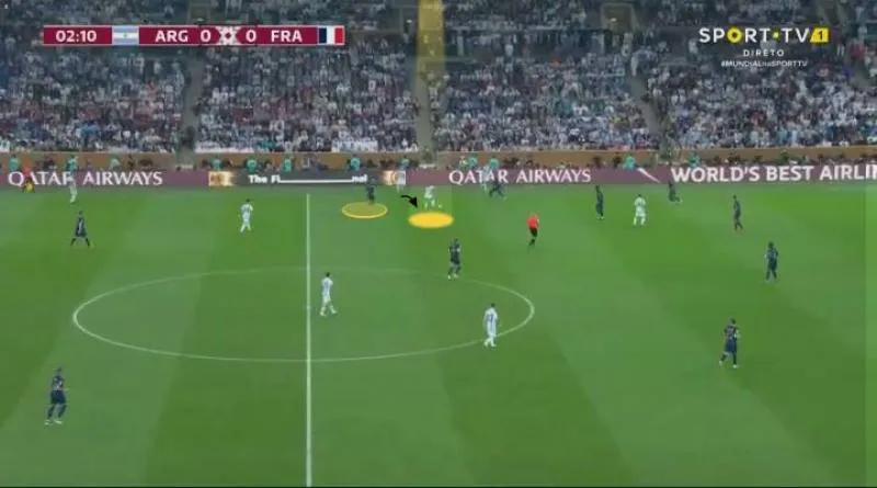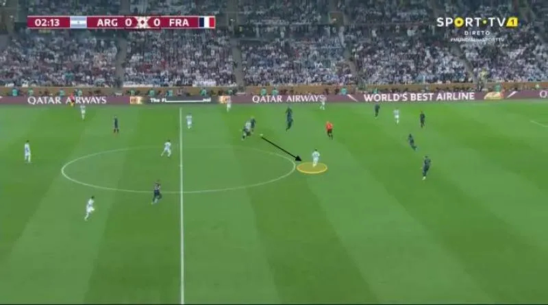 Après deux minutes de jeu, Alexis Mac Allister peut tranquillement recevoir le ballon puis s’orienter face au jeu sur une touche dans le camp français, Antoine Griezmann étant toujours dans le flou sur son positionnement…