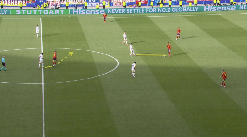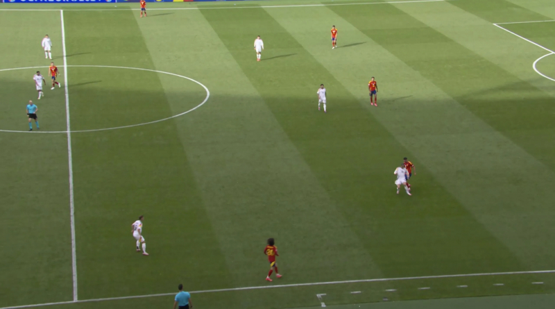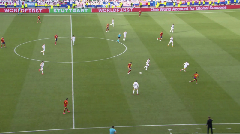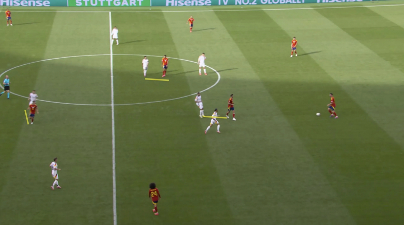 Exemple sur cette situation, après la demi-heure de jeu, qui permet de bien mettre en avant le plan sans ballon allemand : on note bien l’individuel avec Kroos sur les chevilles d’Olmo, Can sur celles de Ruiz et Gündoğan surveillant Rodri.