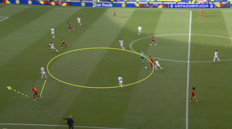 Pour créer le décalage, Rodri va alors reculer d’un cran afin d’attirer Gündoğan, Olmo va s’en aller côté gauche pour embarquer Kroos, et Ruiz va se décaler pour amener Can.