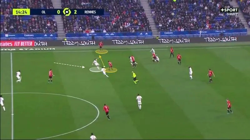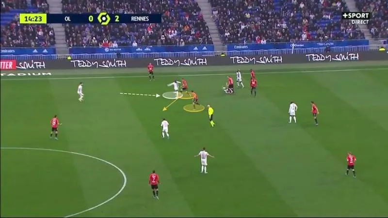 Capables de jongler entre les costumes tactiques cette saison, les Rennais se sont, comme lors de leur démonstration de l’aller, habillés dans un 4-3-3 rythmé par les poumons du duo Santamaria-Majer et sublimé par les mouvements coordonnés d’un trio offensif (Terrier, Laborde, Bourigeaud) intenable. L’idée de Genesio était simple : prendre rapidement le contrôle des débats en misant sur la grande polyvalence de ses hommes pour se sortir du pressing adverse grâce à une forte densité mise dans des périmètres réduits et à une qualité technique supérieure. Rapidement, le coach breton a ainsi vu sa troupe faire cavaler l’OL et l’épuiser psychologiquement grâce à une énorme quantité de courses sans ballon. Il y a quelques mois, Erik ten Hag, le coach de l’Ajax, avait évoqué l’importance de ces courses : « Pour détruire un adversaire, vous avez besoin de ces courses à vide afin de créer de l’espace. Créer de l’espace pour l’autre, c’est la clé du succès. » Le Stade rennais cuvée 2021-2022 est roi de ce petit jeu de pistes qui peut rapidement rendre fou un adversaire mal coordonné défensivement. Le premier quart d’heure de ce Lyon-Rennes en a été la démonstration et, entre les mailles, Martin Terrier, souvent en balade autour de son demi-espace gauche pour démarrer ses combinaisons, a particulièrement brillé, bien aidé par un Laborde toujours aussi malin pour faire reculer la défense adversaire grâce à ses multiples astuces.