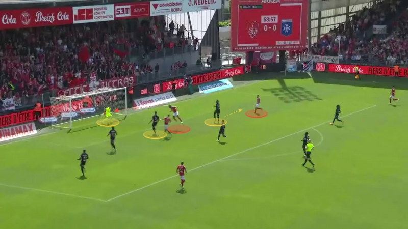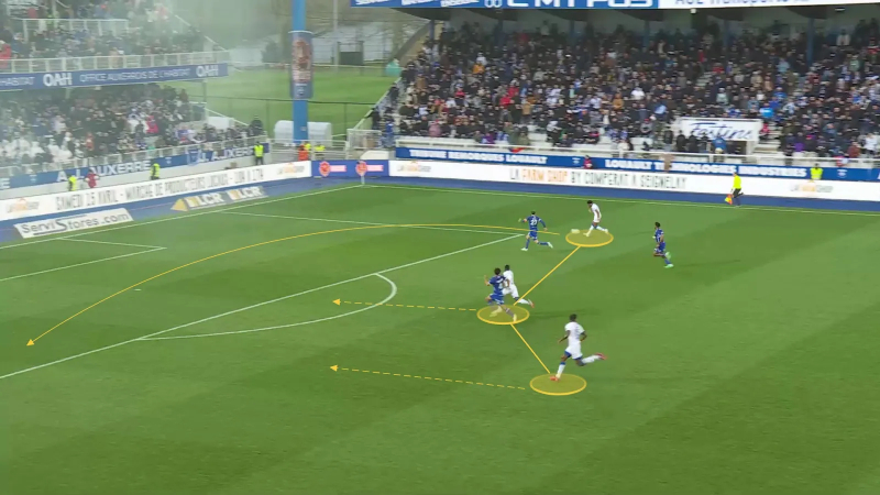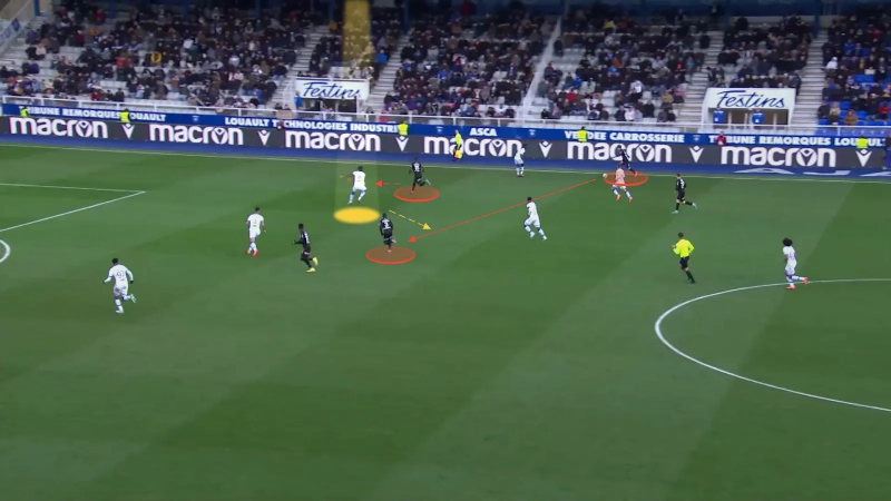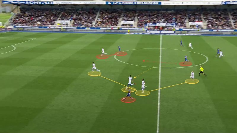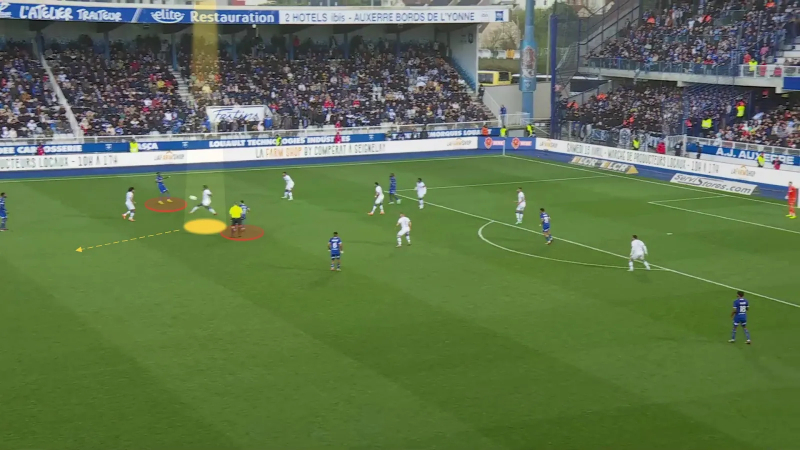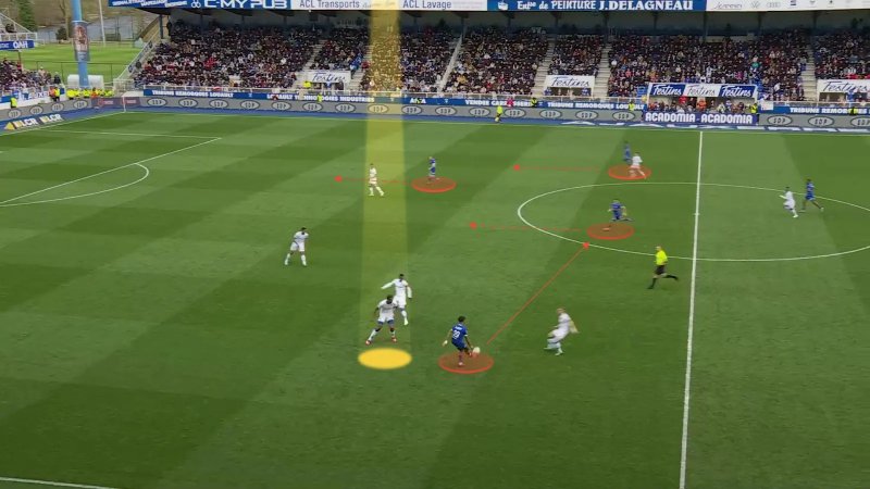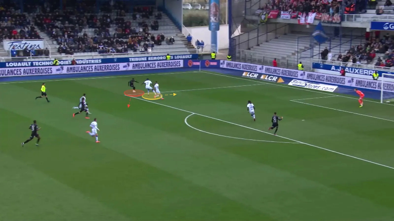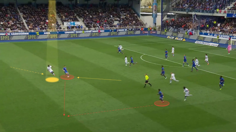 Alors que l’AJA peut compter sur trois joueurs pour freiner la course du porteur excentré, Touré vient lui aussi dans cette zone. Jubal se retrouve alors en 1 contre 1 dans l’axe, et le milieu du terrain est complètement ouvert.