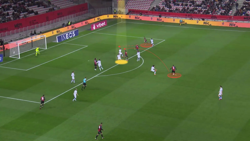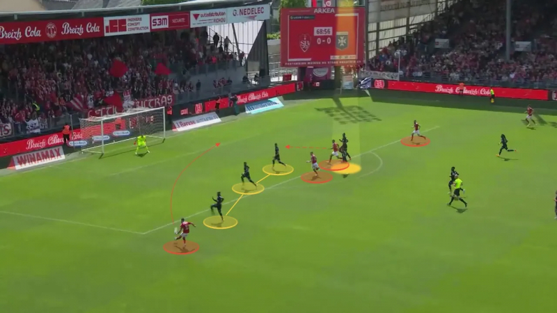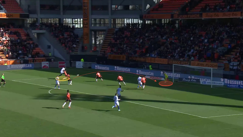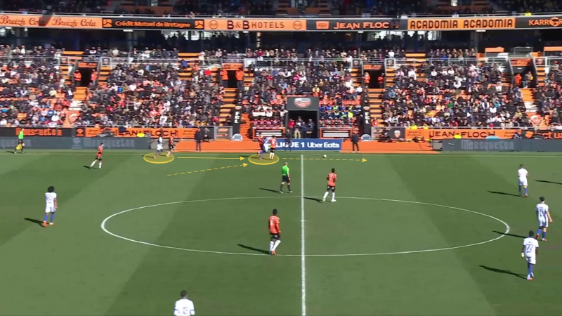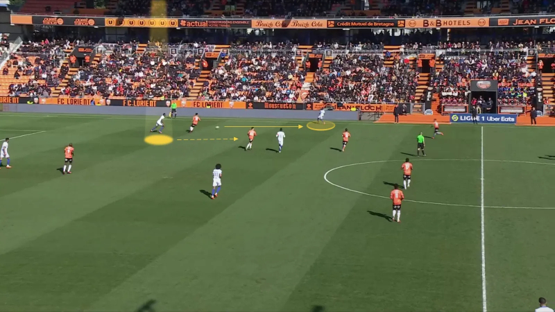 À Lorient (0-1), il est cette fois seul à l’initiative de sa percée. Il décale Mensah côté gauche et se projette rapidement ensuite pour lui offrir une solution…