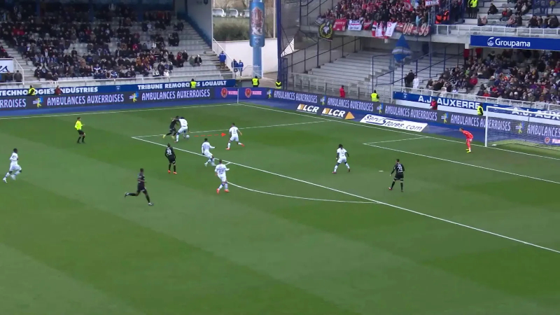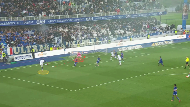 Face à Nice (1-1), Rosario tente de servir Boudaoui lancé dans le dos des Auxerrois par-dessus la défense… Mais le temps de réaction très faible d’Isaak Touré lui permet d’anticiper et d’adopter les bons appuis avant même que l’adversaire ne déclenche sa passe. Ici, il coupera le ballon de la tête.