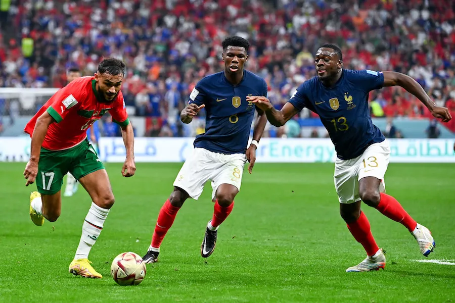 Amputé de Paul Pogba, boussole avec ballon, et de N’Golo Kanté, garant de l’équilibre et de la paix intérieure, le sélectionneur français a dû trouver une alternative. Elle s’appelle Antoine Griezmann. Ce n’est plus un secret, le Français excelle dans cette position de relayeur droit où il peut profiter de son influence pour tenter de camoufler l’absence de La Pioche et de son volume de jeu pour se muer en Griezmannkanté. Tant que ce plan se déroule « à l’énergie » , tout va bien. Mais Griezmann et Dembélé, que l’on peut associer à l’animation défensive du côté droit, ne disposent pas des réflexes naturels du poste sur attaque placée, ce qui permet parfois aux adversaires directs de profiter de beaucoup d’espaces dans des zones dangereuses. Ajoutez à ça une compacité pas toujours optimale – théorème pourtant cher à Deschamps -, et l’ennemi peut alors jouir d’une grande liberté… Celle de penser et d’agir librement. C’est là que le très mobile et excellent Azzedine Ounahi a frappé en première mi-temps, mercredi soir, pour livrer à nouveau un acte de haut vol.