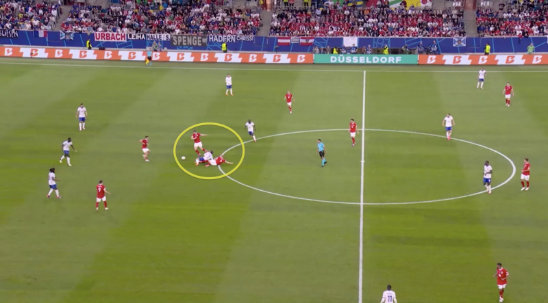 L’autre face du plan, liée, était de répondre à la question suivante : quelle attitude adopter sans le ballon ? Face à une Autriche qui s’est déployée en 3-1-5-1 avec le ballon, avec Seiwald venant souvent se placer à hauteur de Danso et Wöber pour assurer une supériorité numérique à la relance face à un bloc français médian/bas qui a alterné entre un 4-4-2 et un 4-5-1 et Grillitsch en 6, la réponse a été d’empêcher au maximum les trois meneurs rouges placés entre les lignes (Sabitzer, Baumgartner, Laimer) de toucher des ballons dans des zones clés, notamment la fameuse « zone 14 », située juste devant la surface, zone où se font souvent la plupart des différences. La mission a été relevée, les Bleus, solidaires jusqu’au bout des ongles, ayant réduit au maximum l’espace entre la ligne défensive et la ligne des milieux et même laissé les relanceurs autrichiens progresser sans trop s’exposer, malgré le fait que la paire Saliba-Upamecano n’a pas paru être la plus complémentaire du monde et que Kanté évolue à un poste de 6 qui peut parfois l’exposer, lui qui est davantage né pour mordre que pour rester en place. Résultat, l’Autriche a beaucoup centré (28 fois, 2e plus haut total de l’Euro durant la première journée derrière le Portugal) et peu réussi (quatre centres réussis), s’est heurtée à un mur français très dense, fermement tenu par le duo Kanté-Rabiot (les deux ont également excellé sur les transitions défensives), et a dû attendre la 78e minute pour cadrer son deuxième tir, le premier ayant été magnifiquement sauvé par Maignan (38e) dans la foulée d’une grosse erreur de relance d’Upamecano mal compensée.