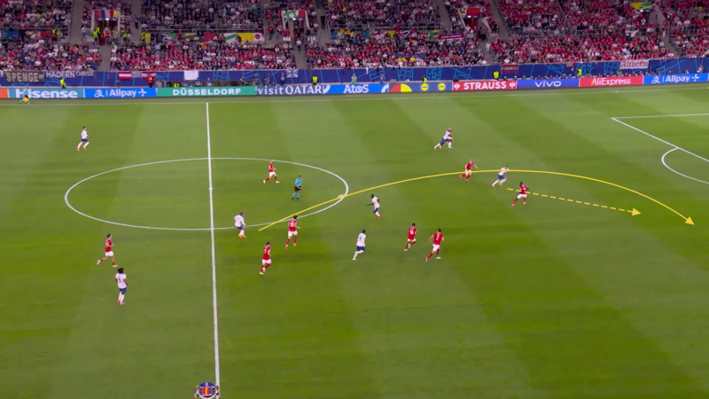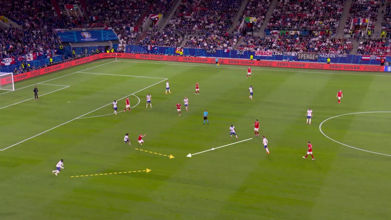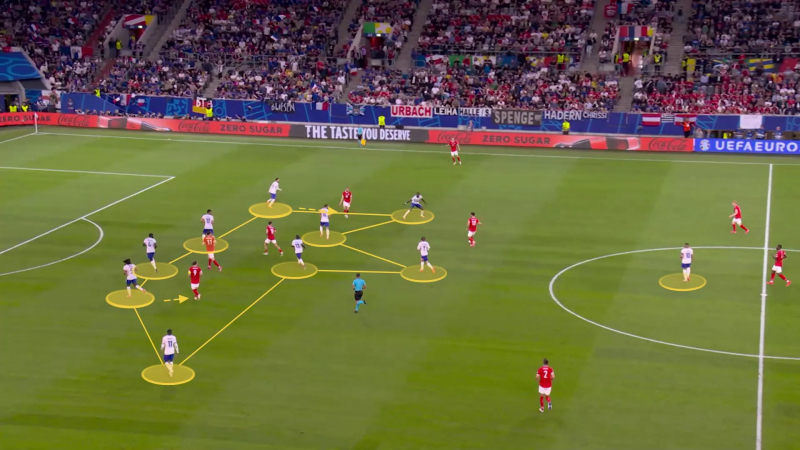 Quelques minutes de jeu auront suffi pour donner le ton du projet de jeu français du soir à la relance. À savoir : éviter dès que possible de passer par les bouchons axiaux et appuyer, une fois un latéral touché (Koundé à droite, Hernandez à gauche), sur la pédale. À droite, cela est souvent passé par les lancements en profondeur d’Upamecano ou Koundé vers Dembélé, ce qu’on a vu sur la première sortie de balle tricolore du soir et ce qui a alors fait de Griezmann une victime, l’habituel moteur du jeu français ayant touché moins de 50 ballons et ayant fini la soirée avec le quatrième total le plus faible parmi les titulaires (Mike Maignan en a touché un seul de moins). À gauche, on a retrouvé le triangle fort de la campagne du Qatar, porté par la percussion de Theo Hernandez, l’énergie de Kylian Mbappé et la science d’Adrien Rabiot, trois hommes qui ont majoritairement, eux aussi, construit le long de la ligne de touche. Les chiffres accompagnent ici l’impression visuelle : lors de la première journée, l’équipe de France, qui a quand même vu Saliba et Upamecano s’aventurer un peu balle au pied, est la quatrième équipe qui a le plus délaissé l’axe – elle n’y a passé que 21% du temps – derrière l’Écosse, la Pologne et la Hongrie. Jules Koundé, après la rencontre : « L’idée était d’éviter de leur donner le ballon dans des zones dangereuses. En première mi-temps, on a, par moments, un peu trop cherché à l’intérieur et on s’est exposé. On sait que l’Autriche vit de ça, des pertes de balle adverses, donc il fallait vraiment minimiser les transitions. »