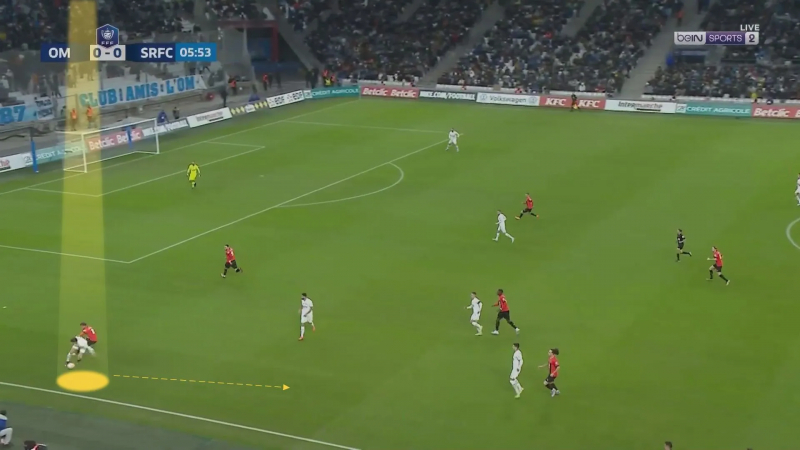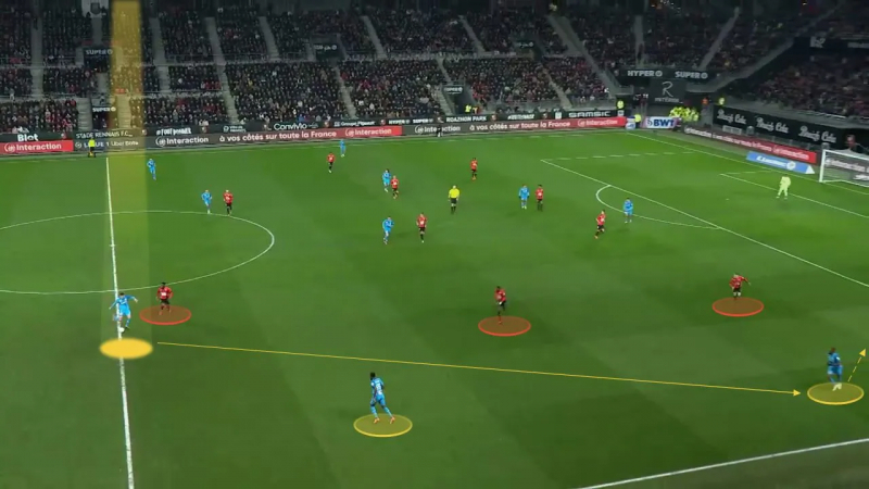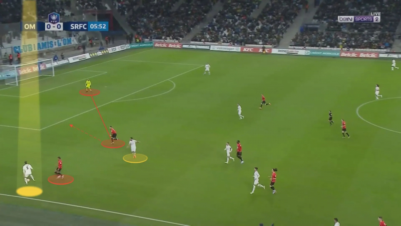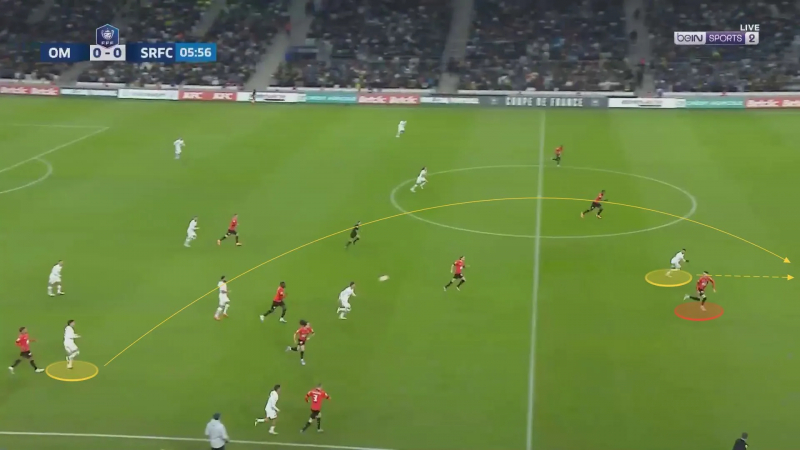 Alors il effectue un râteau long de ligne pour se jouer du jeune Rennais et attaquer l’espace ensuite…