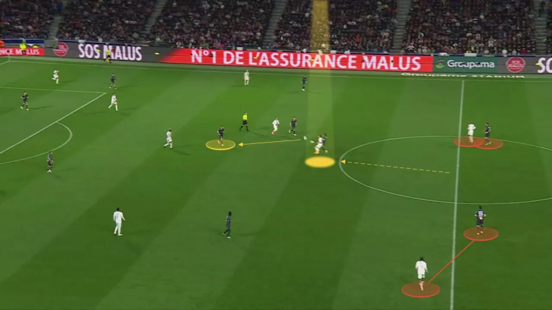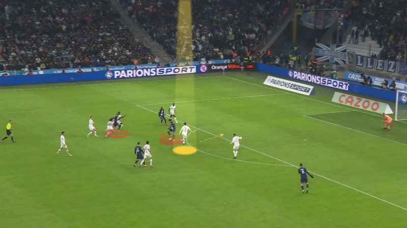 Dans une situation périlleuse, Balerdi doit rapidement réagir. Il est pressé par Desiré Doué, mais ne peut pas jouer en retrait vers Pau Lopez, car Gouiri guette…