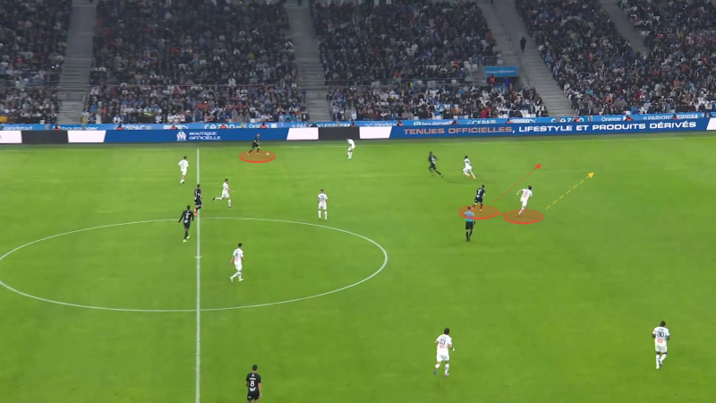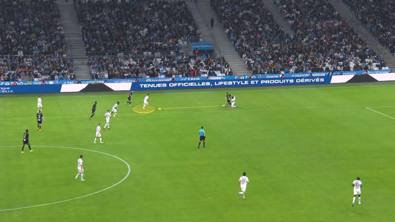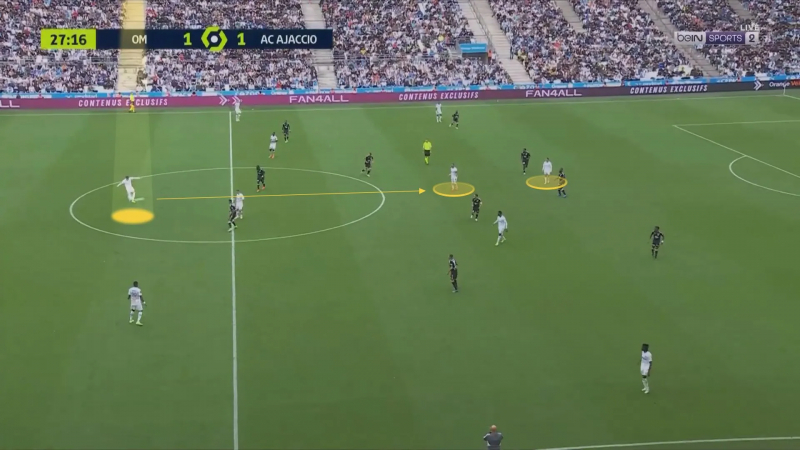 Lors de la réception d’Ajaccio (1-2), il est cette fois responsabilisé à la relance et l’idée de fracturer le bloc adverse pour trouver Dimitri Payet est bonne. Mais la passe sera beaucoup trop puissante, à mi-hauteur, impossible à maîtriser.