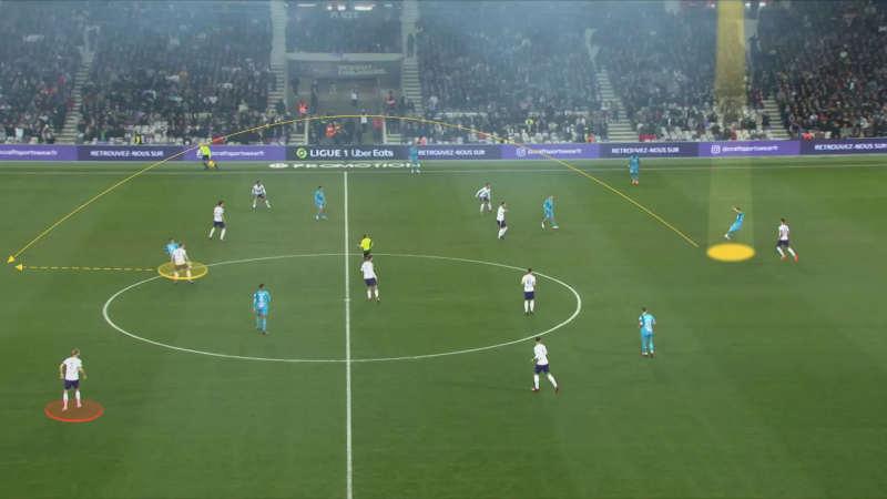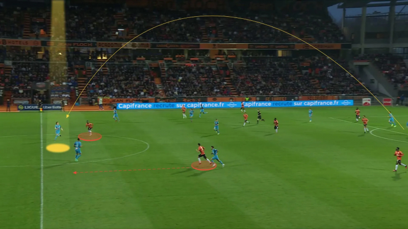 De nouveau face à Rennes (0-1), en Ligue 1 cette fois. L’Argentin, sous pression, saute une étape et joue directement vers Tavares, là où bon nombre de défenseurs auraient d’abord alerté Chancel Mbemba par sécurité. Cette passe offrira un temps d’avance au Portugais qui pourra éliminer Adrien Truffert sur sa prise de balle et percuter vers la surface adverse.