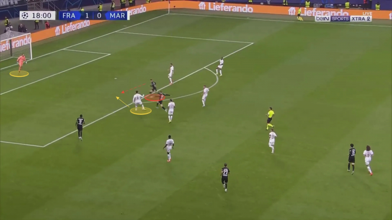 La situation est rapidement interprétée et est bien maîtrisée. Balerdi tacle parfaitement dans les pieds du Français pour trouver Clauss devant lui.