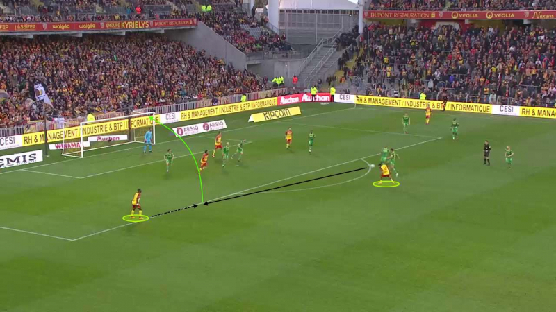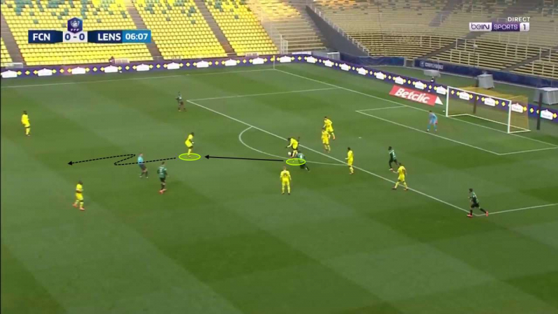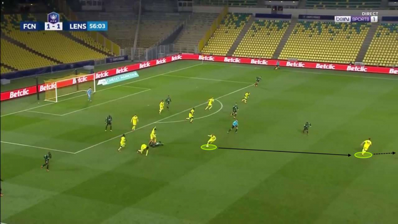 Le néo-Nantais fixe les trois centraux lensois et offre un bon ballon en profondeur à Ganago… qui obtiendra le deuxième penalty du match dans les bras de Jean-Louis Leca, ce qui offrira le but de la qualif.