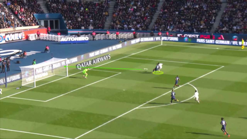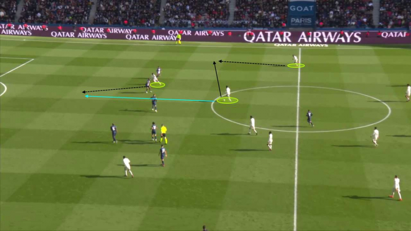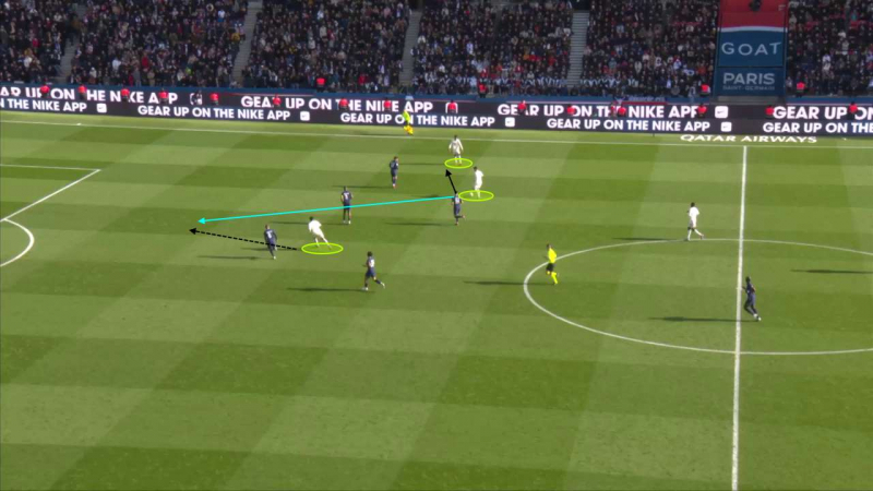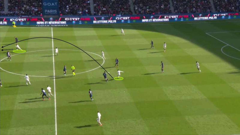 Face au PSG (4-3) le 19 février dernier : André Gomes se retourne et allonge rapidement dans la profondeur vers Jonathan Bamba…