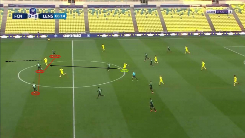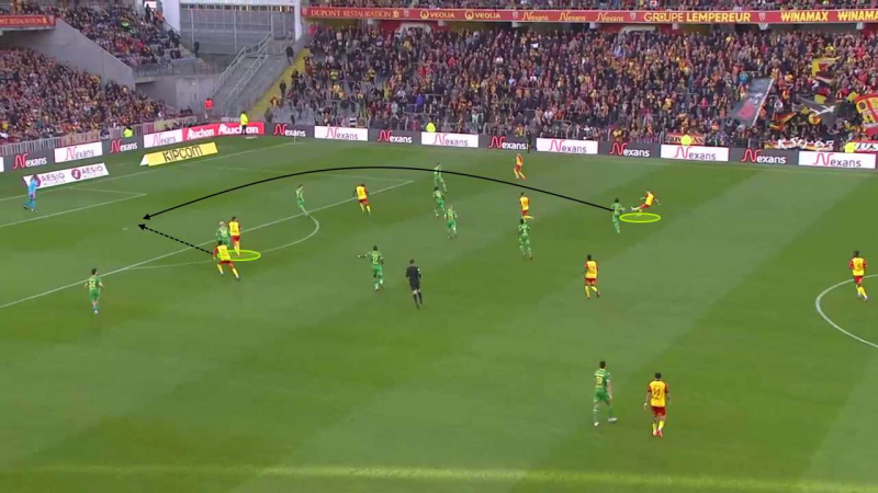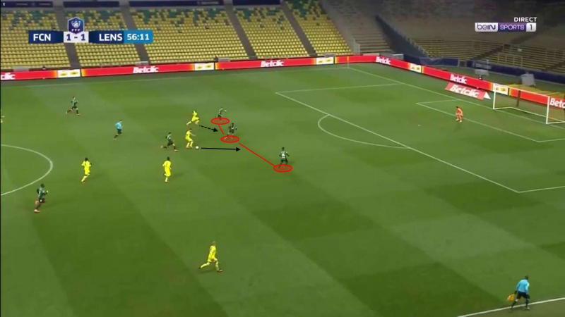 Le 1er mars à Nantes (2-1), Lens implique 6 joueurs dans le dernier tiers adverse et perd le ballon. Samuel Moutoussamy trouve alors rapidement un premier relais vers l’avant en la personne de Moussa Sissoko. Le Français percutera ensuite…