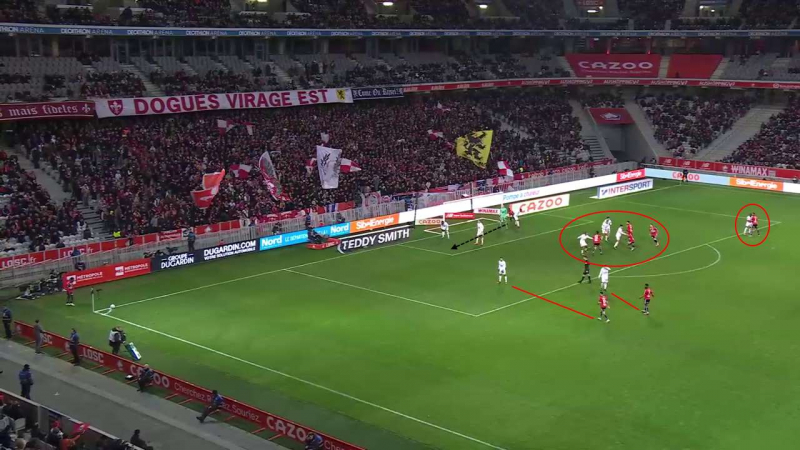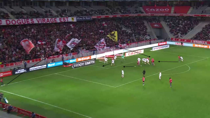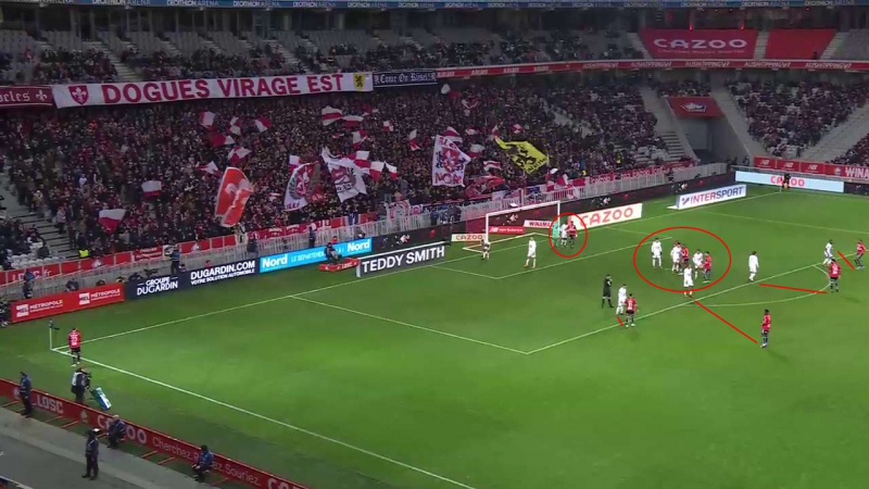 Lors de la réception de Brest (2-1) le 24 février dernier : le LOSC attire quatre Bretons en dehors de la surface pour ouvrir l’espace – en majorité via des joueurs assez peu dangereux dans l’exercice -, 4 contre 4 au point de penalty, 1 contre 1 au deuxième poteau et défense en zone au premier pour Brest…