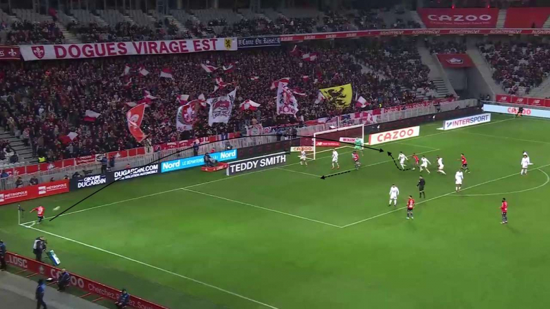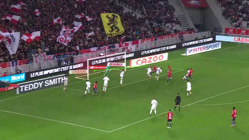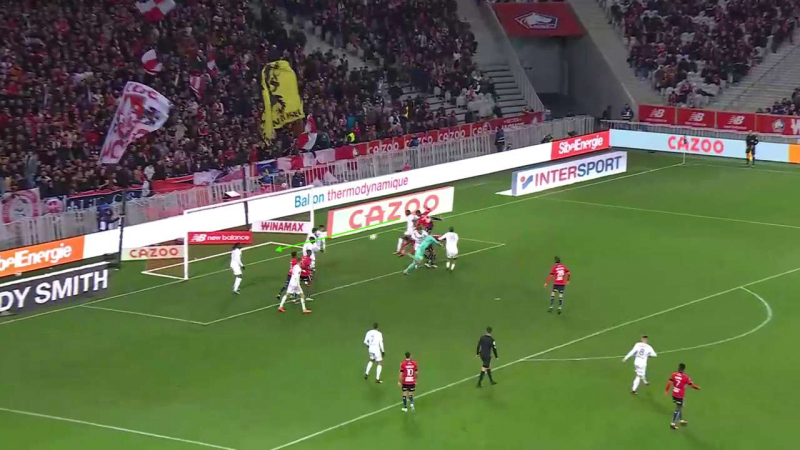 Le corner vise à nouveau le second poteau, plusieurs Lillois plongent au premier pour ouvrir la zone de réception à Alexsandro qui déboule…