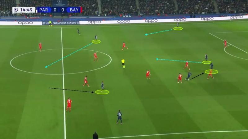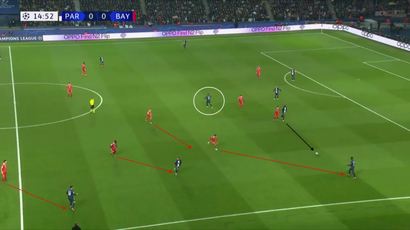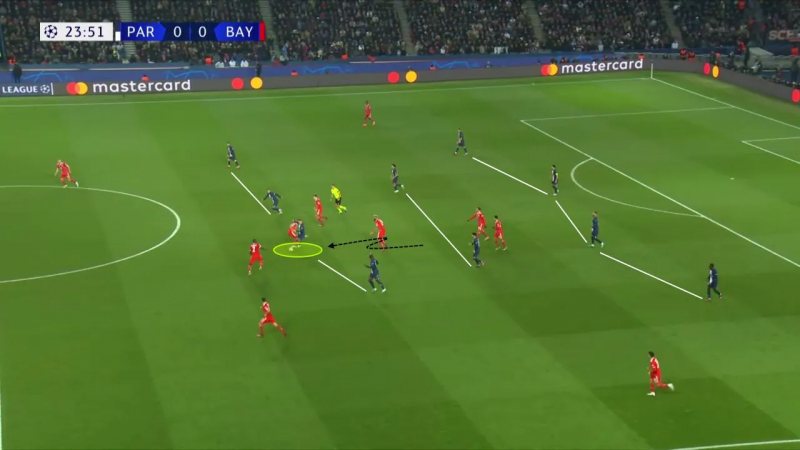 Contre-attaque face au Bayern, Marco Verratti élimine deux joueurs, mais ne dispose d’aucune solution devant lui et devient, de ce fait, le joueur le plus avancé de l’équipe. Le ballon ne peut donc pas avancer… Difficile d’inquiéter Yann Sommer dans ces conditions.