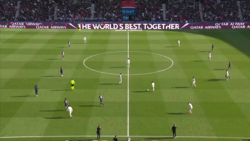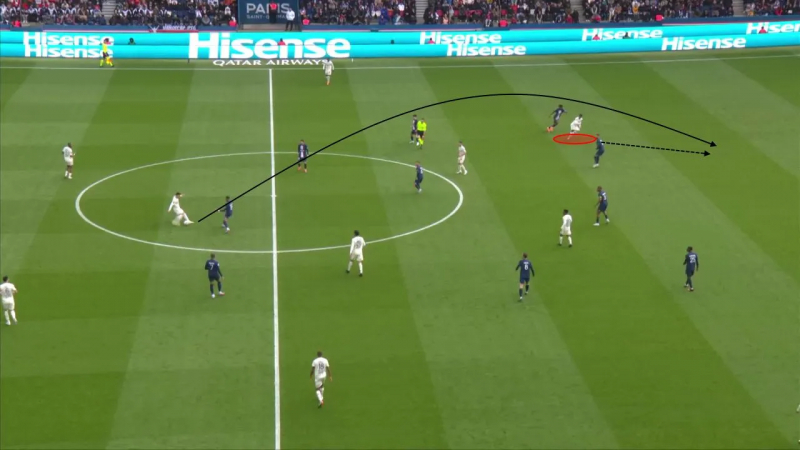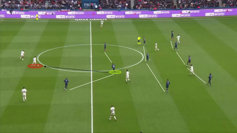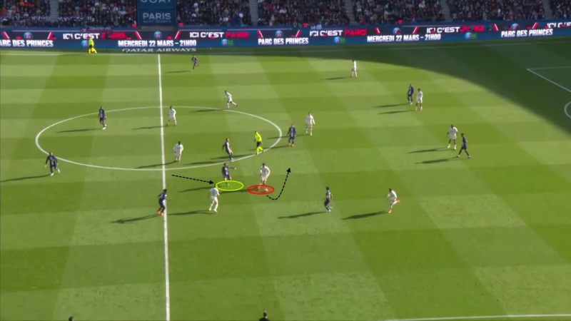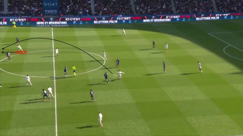 La première ligne de pression adverse est cassée, mais Ramos ne dispose d’aucune option quelques mètres plus haut, les espaces étant mal exploités. Hakimi ne se rend pas disponible à l’opposé, Verratti n’est pas encore en position et Messi n’attaque pas le dos de Neymar à la suite de son décrochage…